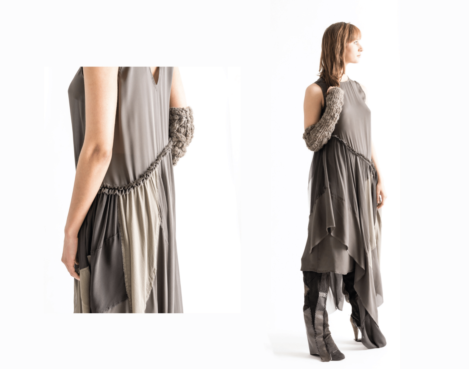 I named this collection forager because I felt the materials used had a found feeling, as if the wearer had found the materials and they were finding their purpose in the collection. Through the patchworking threaded throughout and using the same materials as their flat origin mixed with the manipulated knitted version I was able to let the pieces create their own shapes with little direction from me. They forged their own path on the form and created a purpose.